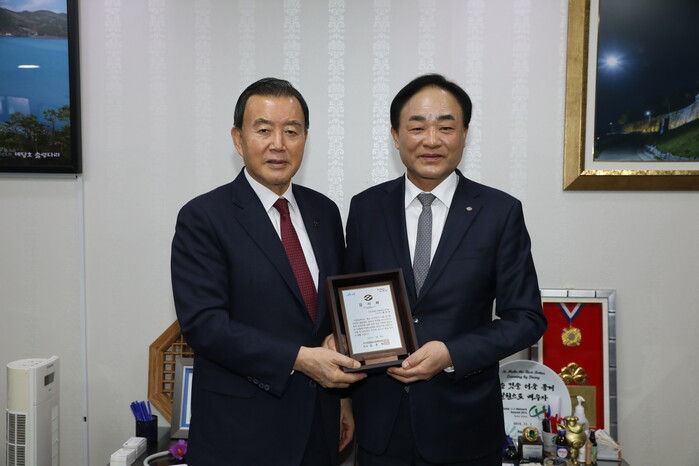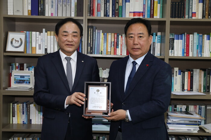 ▲ 임준택 수협중앙회장(사진 왼쪽)이 지난 8일 국민의 힘 홍문표 의원(사진 오른쪽)에게 감사패를 전달하고 있다. |