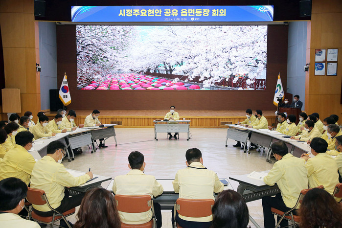 이날 회의는 행정의 최일선에 있는 읍면동장과 소통의 시간 및 당부사항 전달, 시정 주요 현안 사항 설명 순으로 진행됐다.