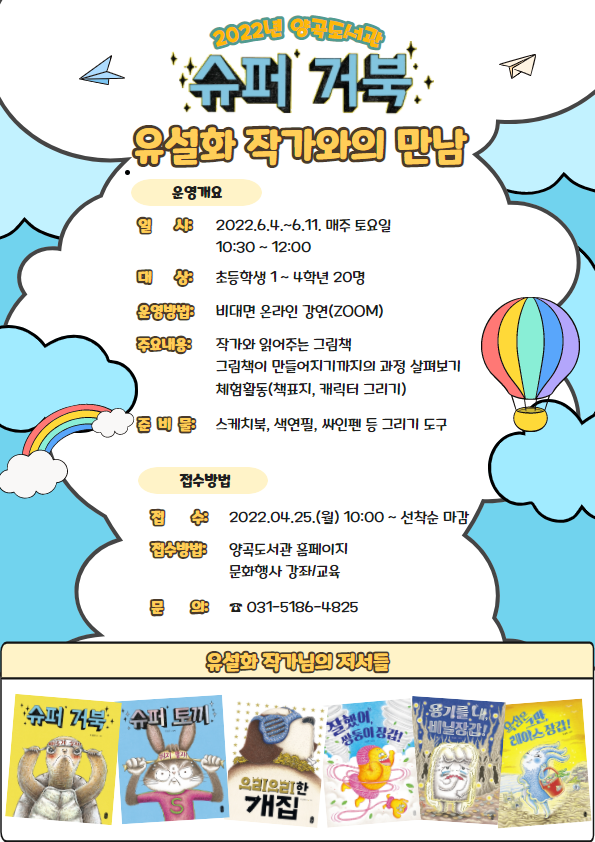 이번 작가와의 만남은 6월 4일~6월 11일 매주 토요일 오전 10시 30분부터 12시까지 ZOOM을 이용한 비대면 온라인 강연으로 진행된다. 유설화 작가가 '슈퍼거북' 등 다양한 그림책을 읽어주며, 그림책이 만들어지기까지의 과정을 알아보고, 자기만의 책 표지, 캐릭터를 그리고 발표하는 독후활동을 진행할 예정이다.