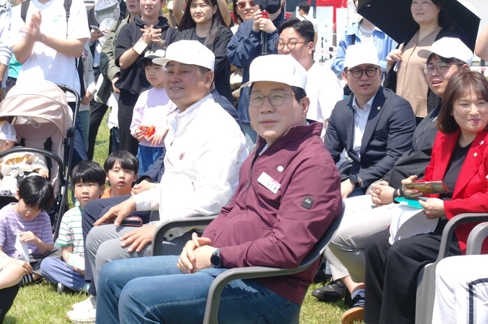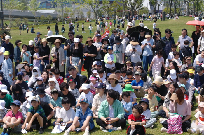 ▲종이비행기 날리기 페스티벌에 참여한 학부모와 어린이들이 잔디밭에 앉아 관람 중이다. |