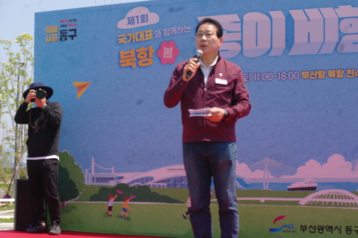 ▲부산 동구 김진홍 구청장이 27일 개막한 봄축제 부산항 북항재개발지구 내 종이비행기 페스티벌에서 개회사를 하고 있다. |
