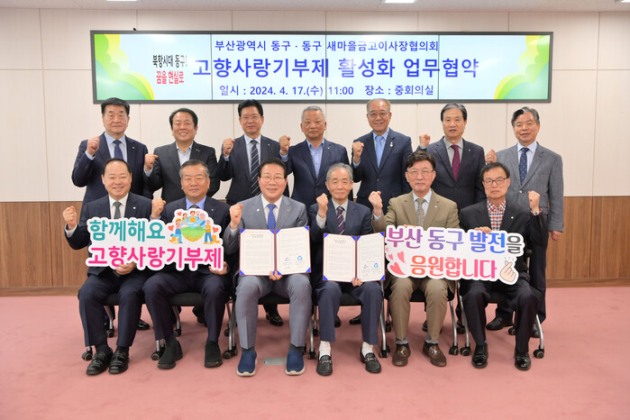 [로컬세계 부산=맹화찬 기자]지난 17일 부산 동구(구청장 김진홍)는 동구 새마을금고이사장협의회(회장 김정기)와 고향사랑기부제 활성화를 위한 업무협약을 체결했다.