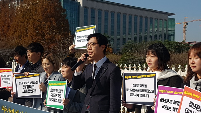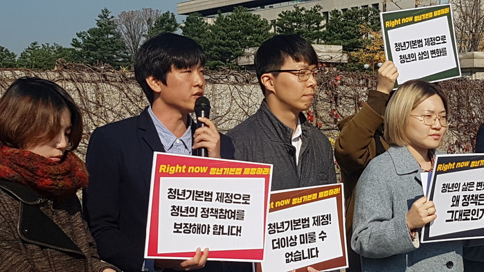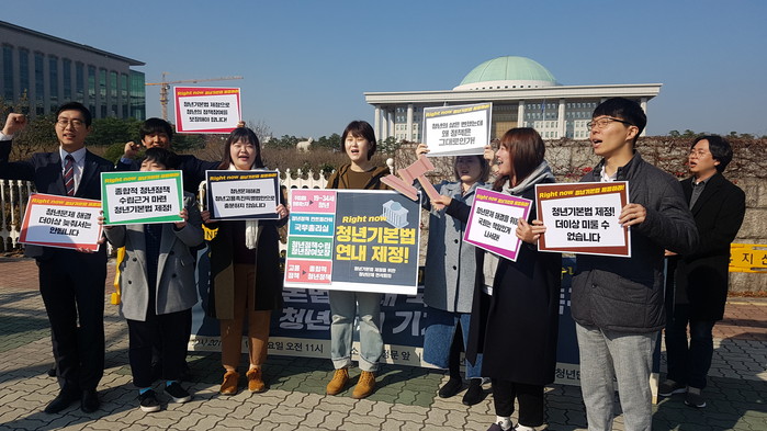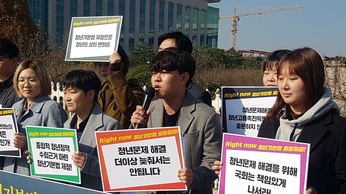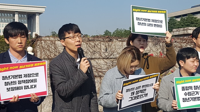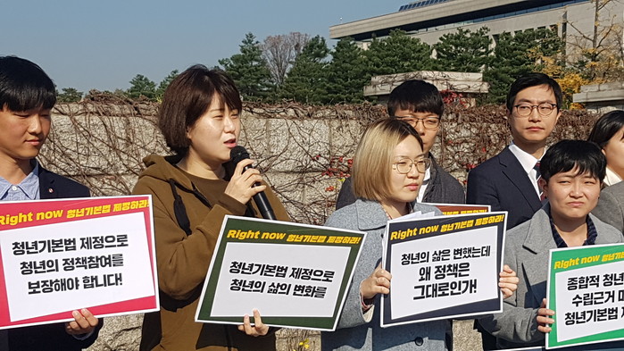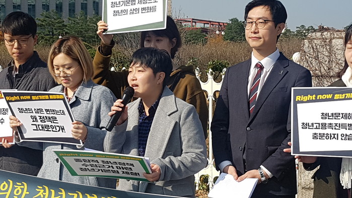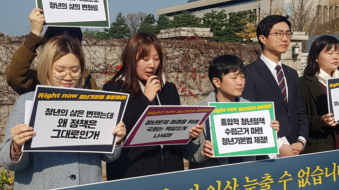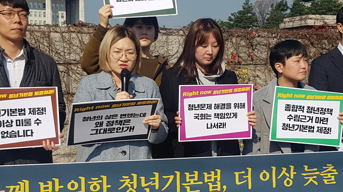 각 단체 청년 대표들이 여야가 합의한 청년기본법안이 발의 6개월이 다 되도록 논의가 미진한 채 계류돼 있다며 조속한 국회 통과를 요구했다.(사진=청년유니온 제공)