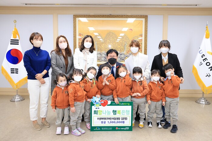 수성구는 이번에 전달받은 성금을 희망수성 천사계좌에 적립해 저소득층을 위한 복지사업에 사용할 예정이다.