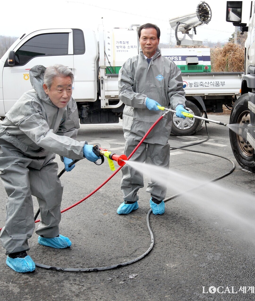 강호동 농협중앙회장은 5일 충북 음성군 삼성면에 위치한 거점소독시설을 방문해 방역 추진 상황을 점검했다. 강호동 농협중앙회장(왼쪽)과 조병옥 음성군수(오른쪽)가 차량소독을 하고있다.