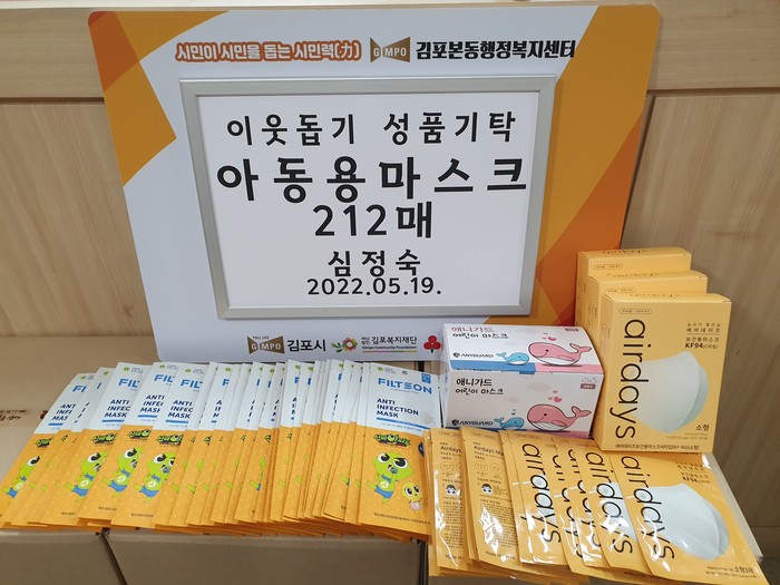 [로컬세계 김병민 기자]지난 5월 19일, 김포본동 행정복지센터(동장 윤은주)에 지역 주민이 관내 아동들을 위한 아동 마스크 212매를 기탁했다.