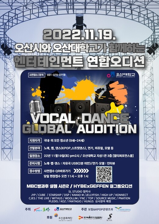 오산시와 오산대학교가 주최하고 오산대 보컬&KPOP 콘텐츠과와 오산중앙청소년문화의집이 주관하는 VOCAL·DANCE GLOBAL AUDITION은 지자체와 교육기관, 유명 엔터테인먼트들의 협력을 통해 진행되는 프로젝트로 가수와 연기자, 댄서(K-POP/스트릿댄스), 비쥬얼, 모델 등 세분화된 선발 분야에서 인재를 선발한다.