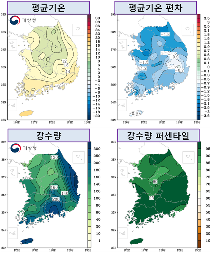 ▲전국 45개 지점과 제주도 2개 지점의 10월 (위) 평균기온과 편차(℃) 분포도와 (아래) 강수량(㎜)과 강수량 퍼센타일 분포도. |