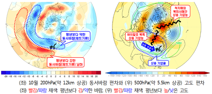 ▲10월 우리나라 주변 기압계 특성에 대한 그림 설명. 상층 기압능의 발달로 기압계의 동서흐름이 다소 정체됐다.(기상청 제공) |