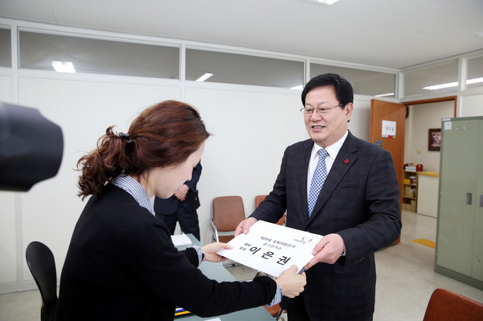 ▲이은권 새누리당 대전중구당협위원장은 15일 중구 선관위에 제20대 예비후보 등록을 하고 있다. |
