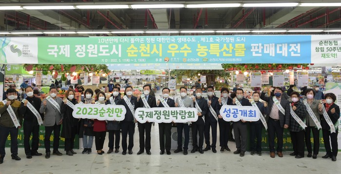 ▲17일(목) 서울 도봉구 농협하나로마트 창동점에서 열린 '순천시 우수 농특산물 판매 대전'에서 순천시 부시장 손점식(사진 왼쪽에서 10번째), 순천농협 조합장 강성채(사진 왼쪽에서 11번째), 농협유통 전무이사 김태룡(사진 왼쪽에서 9번째) 등이 참석하여, 순천시의 우수한 농특산물과 함께 ‘2023 순천만 국제정원 박람회’와 ‘고향사랑 기부제’를 홍보하고 있다. 농협유통 제공 |