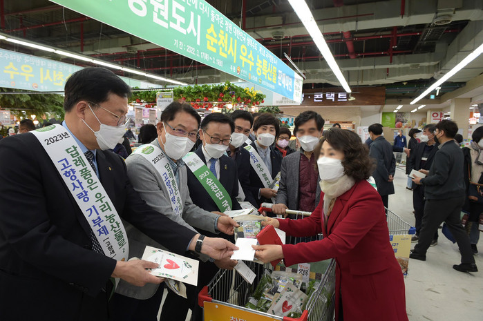 ▲17일(목) 서울 도봉구 농협하나로마트 창동점에서 열린 '순천시 우수 농특산물 판매 대전'에서 순천시 부시장 손점식(사진 왼쪽에서 세 번째), 순천농협 조합장 강성채(사진 왼쪽에서 두 번째), 농협유통 전무이사 김태룡(사진 왼쪽에서 첫 번째) 등이 참석하여, 순천시의 우수한 농특산물과 함께 ‘2023 순천만 국제정원 박람회’와 ‘고향사랑 기부제’를 홍보하고 있다. |