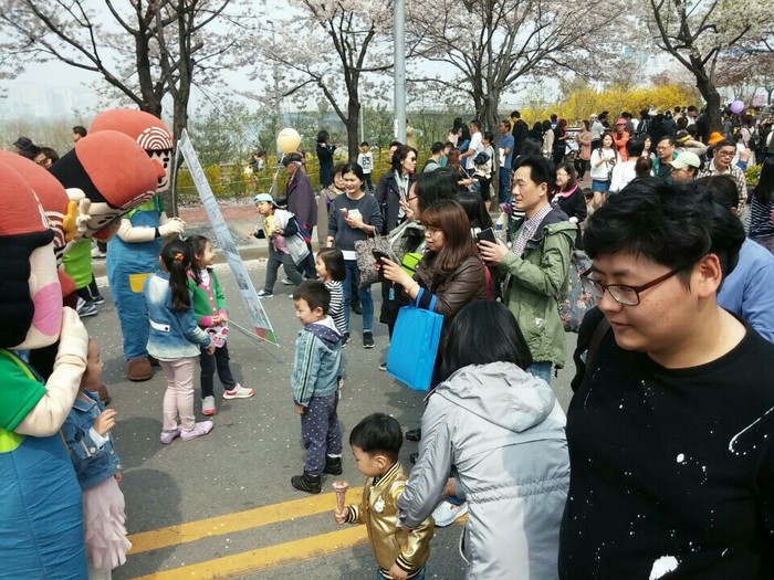 벚꽃축제를 보기 위해 도로를 가득 메운 상춘객들은 eco-5 family와 기념촬영을 하기 위해 50m정도 줄을 길게 늘어서는 진풍경이 펼쳐졌으며, 외국인들까지도 마스코트와 세계친환경디자인박람회에 관심을 나타냈다.