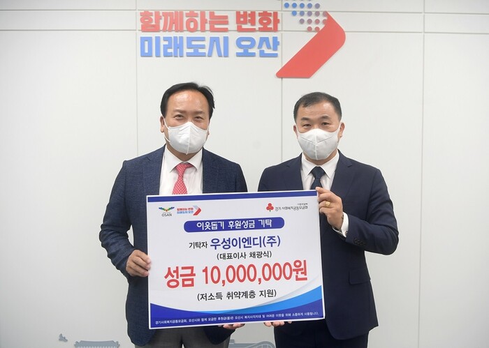 [로컬세계=김병민 기자]우성이엔디(주)(대표 채광식)가 오산시에 지난 7일 영 케어러 지원 및 저소득 가정에 써달라며 이웃돕기성금 1,000만원 기탁했다. 동시에 ‘착한날개 오산’ 업무 협약도 체결해 지역사회 복지공동체 사회안전망 조성에 동참한다.