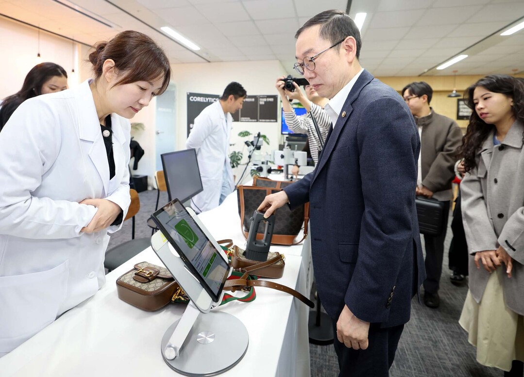 이명구 관세청장이 27일 서울 서초구에 위치한 중고 거래 플랫폼 기업 번개장터를 방문하여 명품가방 등 고가품 감별 과정을 직접 체험해 보고 있다