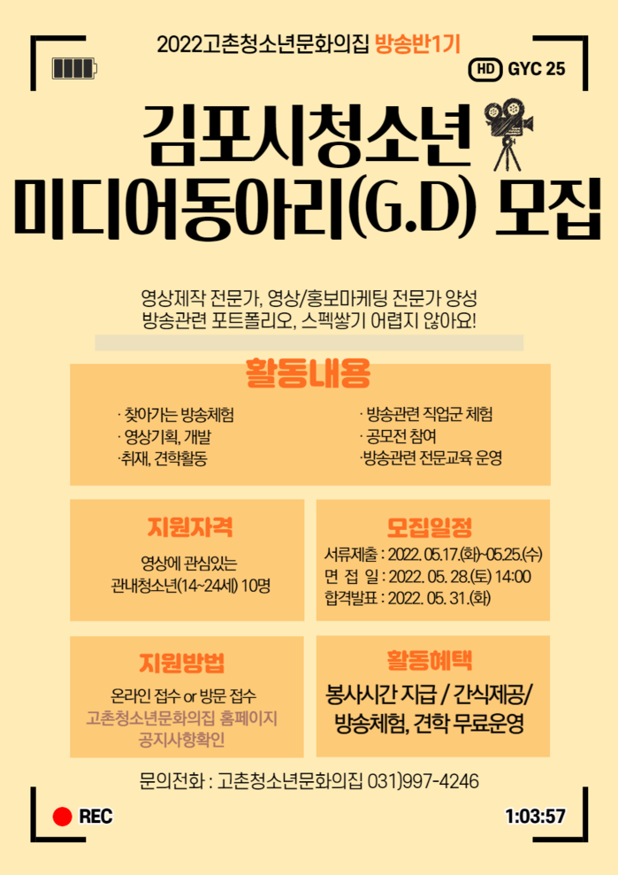 청소년미디어동아리 ‘G.D’는 청소년이 전문교육 및 체험을 통해 영상기획, 촬영, 편집을 운영하며 청소년 맞춤형 미디어 역량강화 프로그램을 진행한다. 활동영상은 김포시청소년재단 유튜브에 업로드된다. 활동혜택은 봉사시간 지급 및 방송체험, 직업인체험 등이 제공될 예정이다.