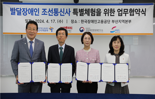 [로컬세계 부산=맹화찬 기자]한국장애인고용공단 부산지역본부는 지난 17일 부산문화재단, 국립해양문화재연구소, 부산시 동구청과 함께 ‘발달장애인 조선통신사 특별체험’을 위한 4자 협약을 체결했다고 18일 밝혔다.
