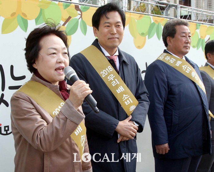 ▲(사)소비자시민모임과 (사)한국배연합회는 29일 서울 광화문 청계광장 앞에서 ‘2018 소비자와 함께하는 우리 배 소비촉진 캠페인’을 개최했다. (사)소비자시민모임 김자혜 회장이 “우리 배 소비촉진”을 위한 인사말을 하고 있다. |