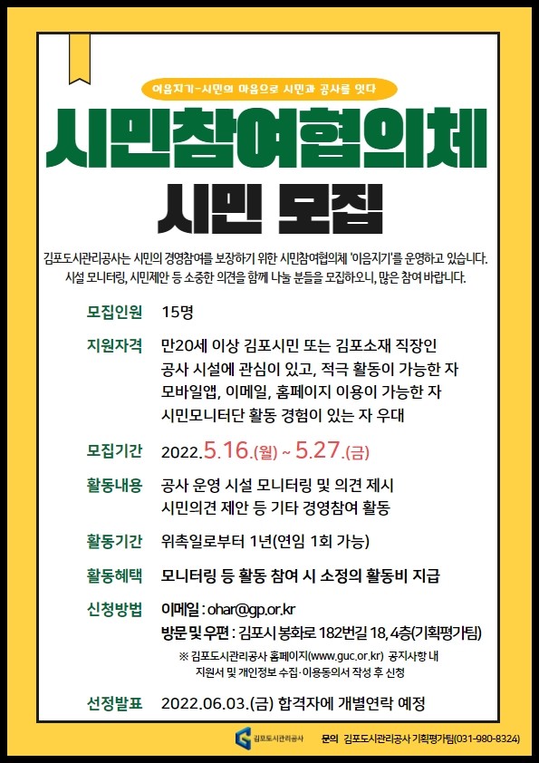 지원대상은 공사에 관심있는 만 20세 이상 김포시민이면 누구나 지원할 수 있으며, 지원을 희망하는 시민은 김포도시관리공사 홈페이지 공지사항에서 제출서류를 작성해 이메일 제출 또는 방문, 우편접수 하면 된다. 기타 자세한 사항은 김포도시관리공사 기획평가팀으로 문의하면 된다.