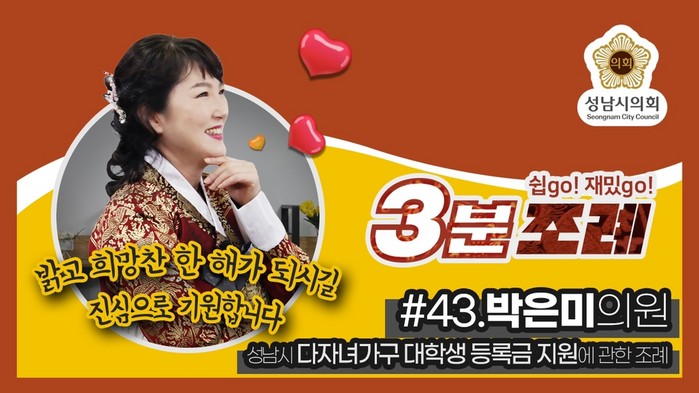 ‘성남시의회 3분 조례’는 유튜브 채널을 통해 성남시의회 의원들이 발의해 시행되는 조례를 시민들이 알기 쉽도록 설명하는 콘텐츠이다.