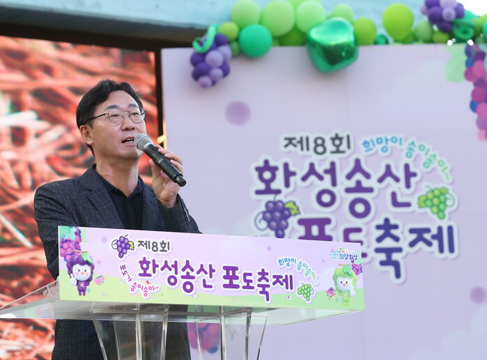 ▲정명근 화성시장이 3년 만에 열린 화성송산포도축제에서 인사말을 하고 있다. 화성시 제공 |