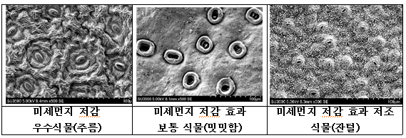 또 보통의 식물의 잎 뒷면은 매끈한 형태이고, 효율이 낮은 식물은 표면에 잔털이 많은 것으로 확인됐다. 잔털은 전기적인 현상으로 미세먼지 흡착이 어려운 것으로 추정된다.