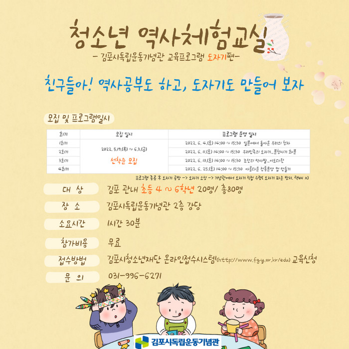 ▲김포시독립운동기념관, 청소년대상 ‘역사체험교실-도자기편’ 운영 홍보물. 김포시 제공 |