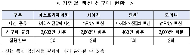 제약사별로는 아스트라제네카 2000만 회분, 화이자 2000만 회분, 얀센(존슨앤드존슨의 제약부문 계열사) 400만 회분, 모더나 2000만 회분을 선구매한다.