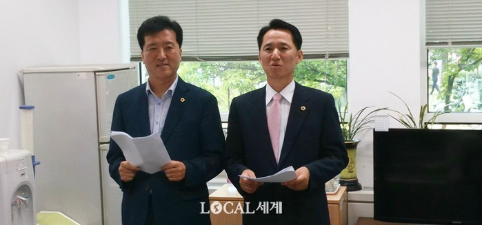 [로컬세계 조윤찬 기자]제7대 후반기 대전시의회 원구성을 놓고 더불어민주당 소속 의원간 내홍이 깊어지고 있는 가운데 더민주 권중순 의원(중구3)과 조원휘 의원(유성구4)이 30일 시의회 기자실에서 기자회견을 열고 의장 및 부의장 출마를 공식선언했다.