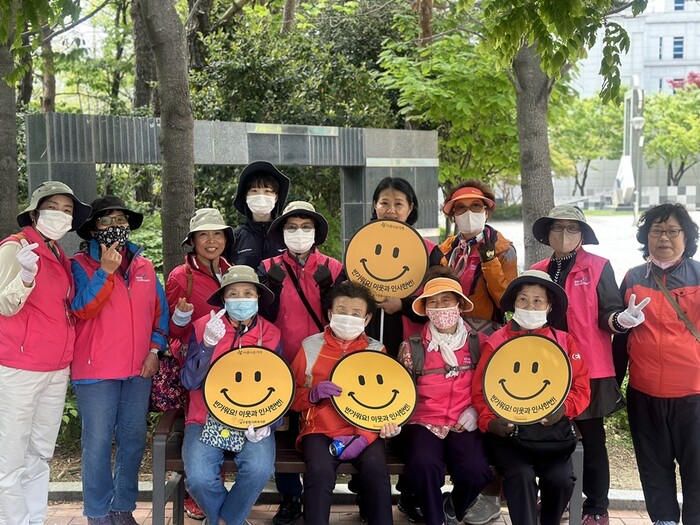 ▲부산 남구 문현2동은 23일 건강생활지원센터의 걷기 동아리 함께 한 '인사 캠페인'을 진행했다. 남구 제공 |