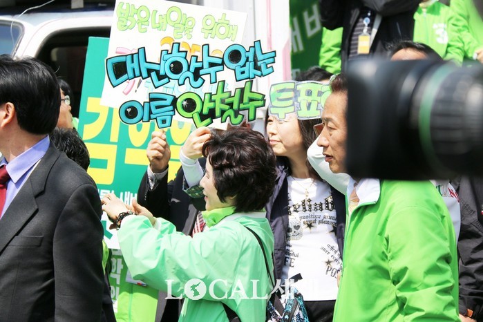 ▲국민의당 지지자들과 시민들이 안 대표의 지원유세를 바라보고 있다. 오영균 기자. |