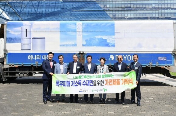 시는 이날 오전 11시 시청 광장에서 신상진 성남시장과 김병삼 ㈔월드휴먼브리지 대표 등이 참석한 가운데 ‘폭우피해 저소득 수재민 가전제품 전달식’을 했다.