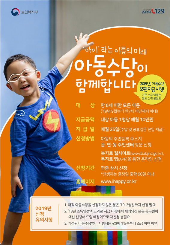 아동수당은 그 동안 소득 상위 10%를 제외하고 월 10만원씩 지급했으나, 지난 1월 ‘아동수당법’ 개정에 따라 4월부터 부모의 소득·재산과 상관없이 모든 아동에게 지급하게 된다.