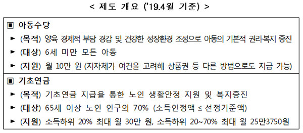 4월부터 아동수당이 만 6세 미만 모든 아동에게 월 10만원씩 지급되고, 65세 이상 소득 하위 20% 노인은 기초연금을 최대 월 30만원 받는다.