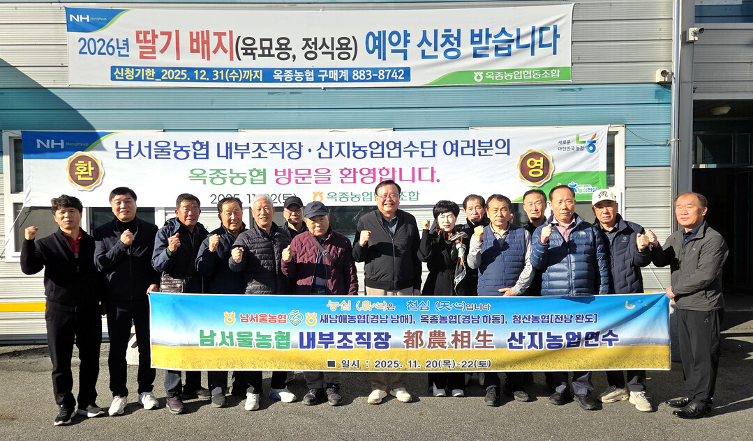 남서울농협(조합장 안용승)은 내부조직장(영농회장, 작목반장) 역량강화와 도농교류 확대를 통한 지속 가능한 농업발전 기틀을 마련하고자 지난 20일부터 2박3일 일정으로 자매결연 및 유관농협을 방문하였다. 이번 방문은 남서울농협과 지속적으로 교류하고 있는 경남 하동 옥종농협(조합장 조호남)을 방문하여 상호간담회를 갖고, 산지 경제사업장을 둘러보며 농산물 생산과 유통분야에 대한 우수사례를 공유하였다. 농협 제공