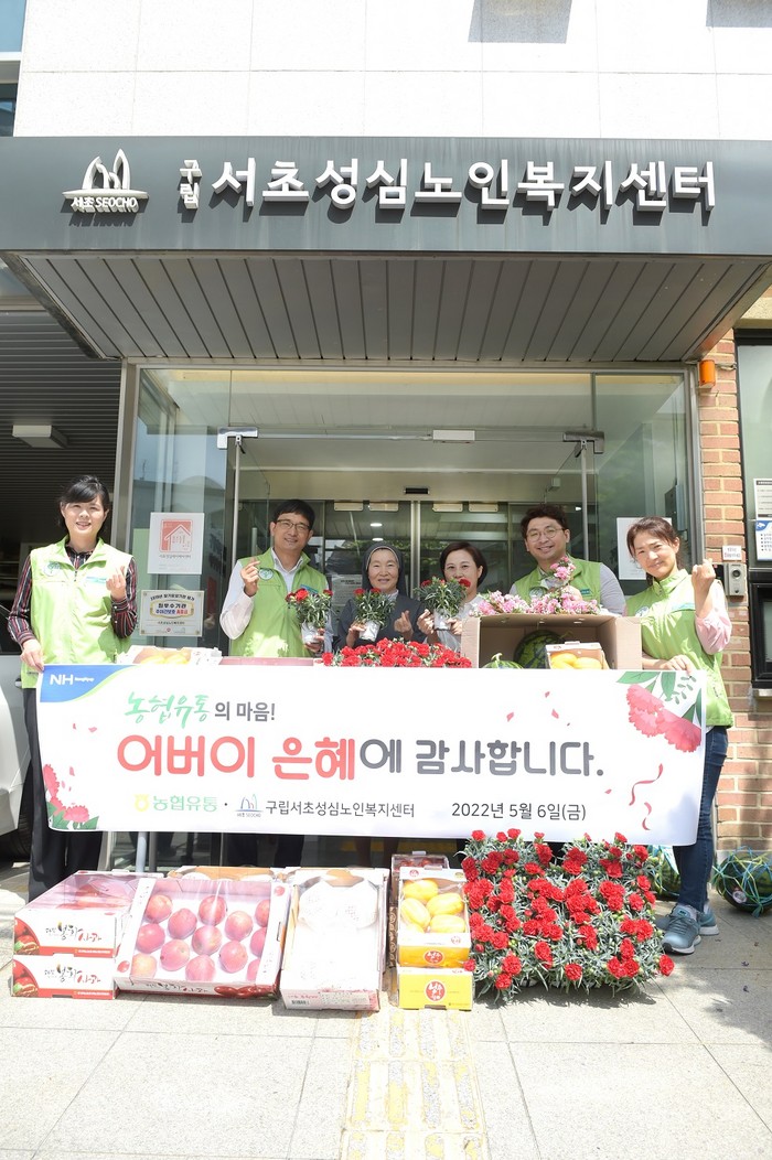 6일 농협유통 임직원들은 가정의 달인 5월 어버이날을 앞두고 오랜 기간 지속된 코로나19로 지친 어르신들의 마음을 달래드리기 위해 서초구립 성심노인복지센터에 방문해 어르신들께 과일 및 카네이션과 함께 따뜻한 온기를 전달했다.