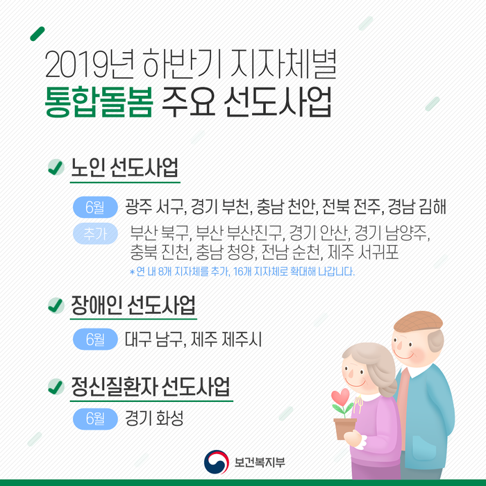 지역사회 통합돌봄 선도사업은 통합돌봄 서비스 제공을 실시해 보고 지역주민의 욕구와 지역 상황에 맞는 통합돌봄 모형을 찾아나가고자 추진됐으며 이달부터 전국 단위 공모를 통해 선정된 8개 기초자치단체에서 실시된다.