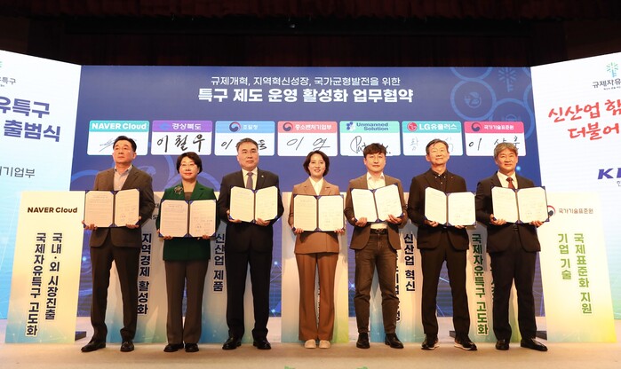▲LG유플러스는 중소벤처기업부와 함께 규제자유특구에 신산업 육성을 촉진하기 위한 협력 네트워크 '상생이음'의 출범식을 갖고 업무협약을 체결했다. 사진은 주요 관계자들이 출범식에서 기념촬영을 하는 모습. (왼쪽부터) 김태창 네이버클라우드 사업총괄, 이달희 경북도 경제부지사, 이종욱 조달청장, 이영 중소벤처기업부 장관, 강찬호 언맨드솔루션 대표, 황현식 LG유플러스 대표, 오광해 국가기술표준원 표준정책국장 |