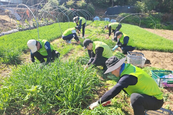 ▲ 공판사업부 직원들이 28일 경기 남양주 소재 부추 농가를 방문하여 일손돕기를 실시했다. |