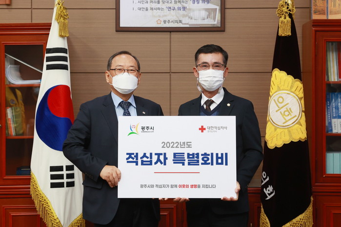 [로컬세계 김병민 기자]경기 광주시의회 임일혁의장은 지난 6일 의장실에서 2022년 적십자 특별회비를 전달하며, 추운 겨울 따뜻한 나눔의 문화를 전파하는데 동참했다.
