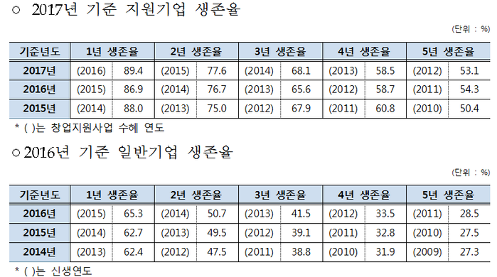 2일 중소벤처기업부가 지난달 발표한 ‘창업지원기업 이력·성과 조사’에 따르면, 2017년 기준 창업지원기업의 5년 생존율은 53.1%로 일반창업기업의 생존율 28.5%(통계청 기업생멸행정통계, 2016년 기준)보다 높게 나타났다고 밝혔다.