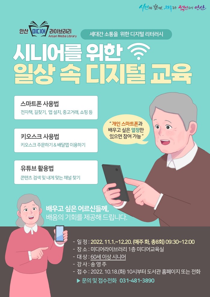 [로컬세계=김병민 기자]경기 안산시(시장 이민근) 미디어라이브러리는 60세 이상 어르신을 대상으로 ‘시니어를 위한 일상 속 디지털 교육’을 운영한다고 14일 밝혔다.