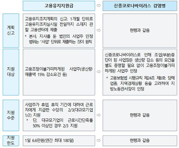 ▲현행 고용유지지원금과 신종코로나바이러스 지원요건 비교. |