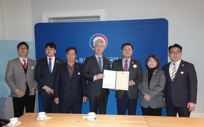 [로컬세계 부산=기우치 기자]부산 동구의회의 '2030세계박람회 부산유치국외홍보단'(단장 이상욱 의장)은 23일 노르웨이 오슬로에 위치한 대한민국 대사관을 방문해 김필우 주 노르웨이 대사와 면담한 뒤 '2030월드엑스포가 부산에 유치될 수 있도록 호소하는 내용이 담긴 동구의회 명의의 서한문'을 노르웨이 총리에게 전달해달라고 요청했다.