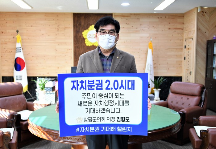 [로컬세계 오승용 기자]김형모 전남 함평군의회 의장이 자치분권 2.0 시대의 개막을 축하하고 지방자치 실현을 위한 ‘자치분권 기대해 챌린지’와 어린이보호구역 내 교통안전문화 정착을 위한 ‘어린이 교통안전 릴레이 챌린지’에 동참했다.