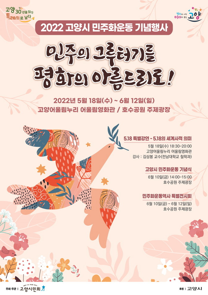 [로컬세계 이영원 기자]경기 고양시는 오는 18일부터 6월 12일까지를 민주화운동 기념 기간으로 정하고 ‘민주의 그루터기를 평화의 아름드리로!’라는 슬로건 아래 4·19혁명, 5·18민주화운동, 6·10민주항쟁 등 우리나라 민주화운동 기념사업을 추진한다.