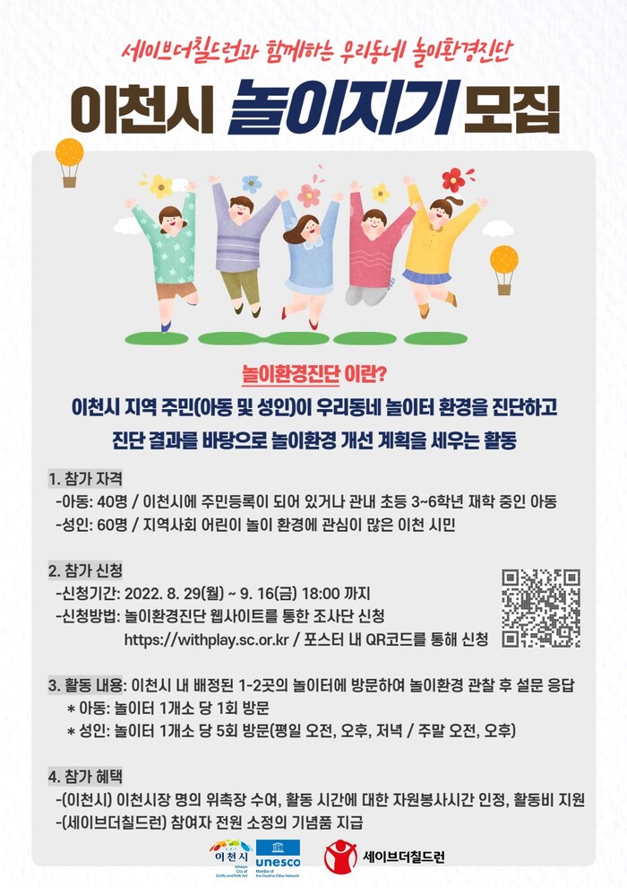 모집 이후 이천시는 ‘이천시 놀이환경 진단사업’을 통해 도출되는 진단 분석 결과에 기반하여 지역여건에 맞는 이천시 놀이환경 개선 계획을 수립하고 아동의 놀권리가 보장되는 아동친화도시 조성을 위한 지속적인 노력을 계속 해 나갈 예정이다.
