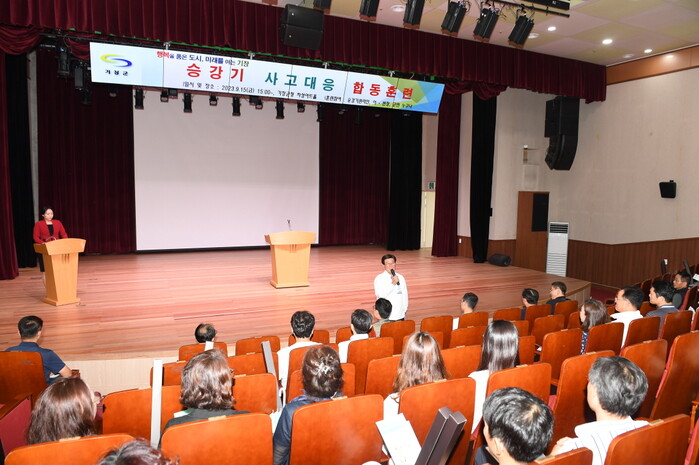| ▲ 부산 기장군(군수 정종복 앞 중앙,)은 청사에서 기장소방서,유관기관과 함께 ‘2023년 승강기 사고대응 합동훈련’ 을 진행했다.기장군 제공 |