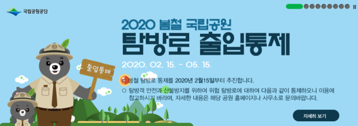 환경부 산하 국립공원공단은 봄철 산불방지 대책기간을 오는 5월 15일까지로 정하고 산불 예방을 위해 103개 탐방로를 15일부터 5월 15일까지 통제한다고 11일 밝혔다.