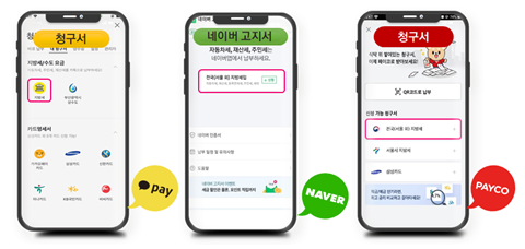▲지방세 고지알림. 카카오톡 앱() , 네이버 앱(NPay - ), 페이코 앱(청구서) |